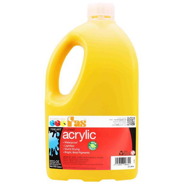 Fas Warm Yellow Student Acrylic Paint is a non-toxic, fast drying and versatile acrylic paint suitable for home and school use. The paint has vibrant pigments for intense colour and can be mixed together easily. Compatible with a variety of painting mediums such as Gesso, Texture Paste, Impasto Gel and more. Suitable for use with paper, card, canvas, wood, fabric, plastic and more. Easy soap and water clean up.