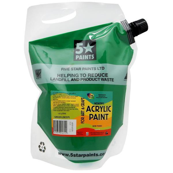 Five Star NZACRYL paint in Deep Green is ideal for use in both the home and at school. The paint is non-toxic, quick drying, water resistant, light fast and has a smooth consistency that provides good coverage with bold, bright colour. It is versatile and can be used with a variety of painting mediums such as Texture Paste, Impasto Gel, Moulding Paste and more, making it ideal for a range of creative painting projects. Suitable for use with standard & wet strength cartridge paper, newsprint, canvas card & board, acrylic paper and more. Cleans up easily with soap & water. The 1.5 litre pouch features an easy pour spout and handle for simple paint distribution.