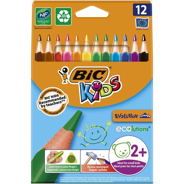 BIC Kids Evolution Triangular Colouring Pencils are wood-free pencils with bright and fun colours, which are ideal for those first works of art. They come with colour coated exteriors that match the leads for easy colour identification. The triangular shape will teach children to correctly position their fingers on the pencil.