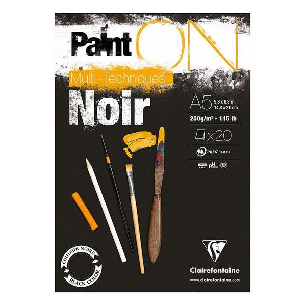 The Clairefontaine PaintON Pad features a deep black shade paper that has slightly rough grain ideal to enhance creations in light colours. This mass-tinted paper will offer a profusion of contrasts while varying techniques. The black paper heavy weight is ideal to adapt to mixed media such as pencil, charcoal, pastel, felt tip, Indian ink, marker, and gouache.