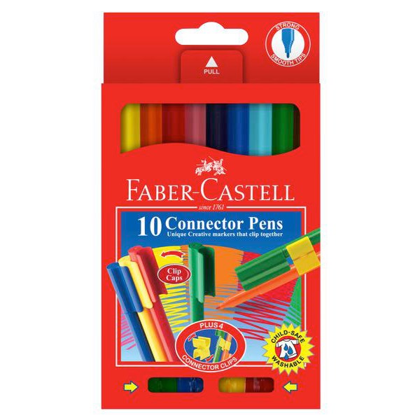Faber-Castell Connector Pens have superior inkfill and reservoir sizes. They feature brilliant water-based non-toxic colours and a special airtight "click seal" which helps prevent drying out. Unique child safe connector caps clip pens together for easy storage and creative play.