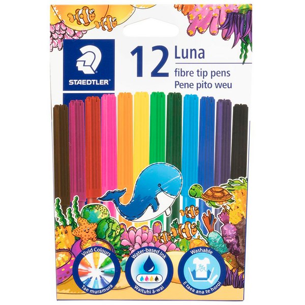 Choose these Staedtler Luna Felt Tip Markers to add bright, vivid colours to your artwork, school work, colouring in and projects. The quality felt pens have 1.0mm fine tips that are pressure resistant to last longer. The non toxic pens feature a water based ink that washes out of most textiles easily. Ink colours are designed not to fade. The pen cap is ventilated to help reduce the risk of choking if it is swallowed.