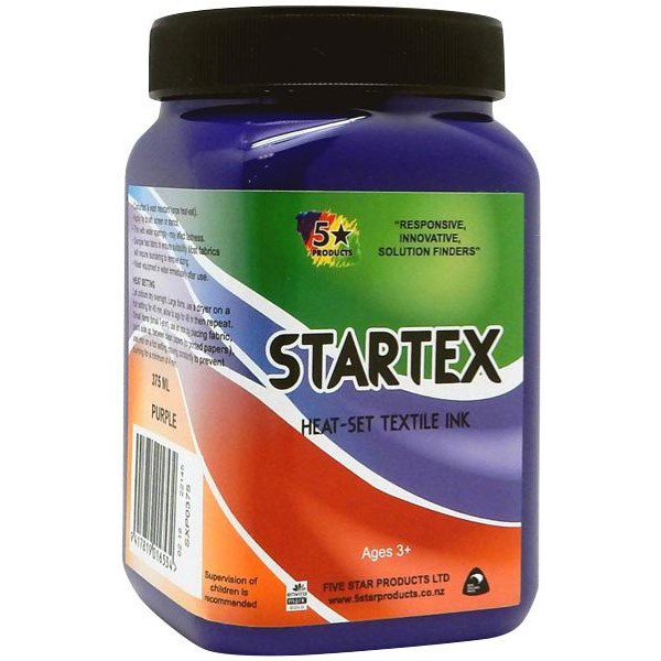 The Five Star Startex Textile Ink is water based and suitable for fabric painting and printing. Fully intermixable range of colours which becomes wash resistant once heat sets. Apply by brush, screen or stencil. For best results use white or light coloured fabric. Also available in 1L or a pack of six 30ml containers.