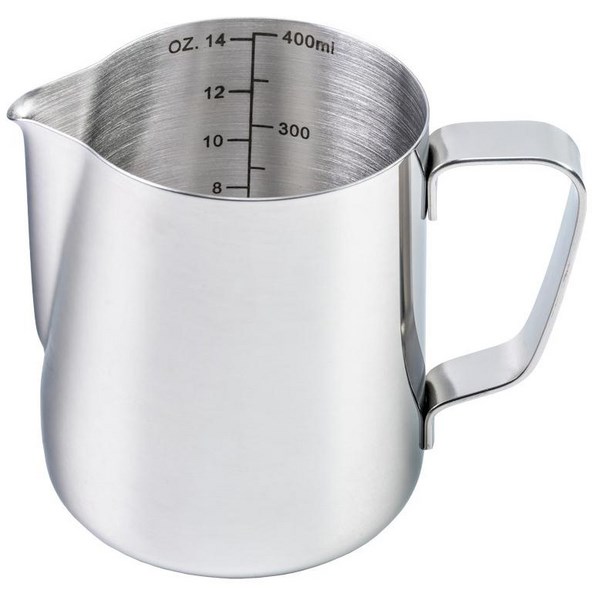 This Stainless Steel 400ml Milk Jug provides you with the quality equipment needed for veteran and novice baristas to create the perfect coffee. The 1mm thick food-grade stainless steel body provides a great weight and professional-feeling pitcher designed for smooth pouring and latte art, with a smart design for your office space or kitchen at home. It features accurate etched measurements in ounces and millilitres on the internal side of the jug, to remove any guess work and help reduce milk waste.