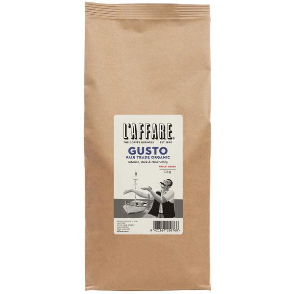 L'affare Gusto Fair Trade Organic Coffee is sure to please any coffee drinker with its rich, intense flavour which has hints of plum and dark chocolate. It is great for all brewing methods but is especially good for espresso. The beans are sourced from Central America and East Africa and blended and roasted by L'affare's top roasters.