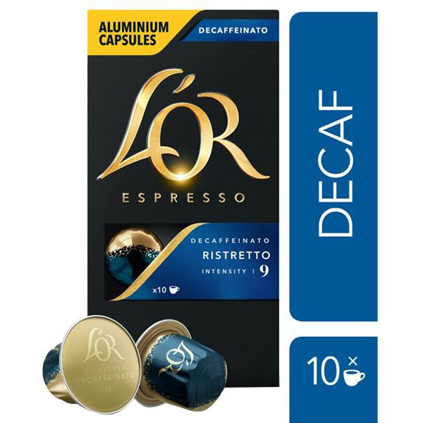 These L'OR Espresso Decaffeinato Ristretto Coffee Capsules designed to fit Nespresso* coffee machines, are made from carefully selected coffee beans offering exotic flavours and a powerful and spicy aroma. This tasty blend of decaffeinated coffee captures rich, sweet notes of marzipan contrasted with a fresh citrus burst. The airtight capsules are made of aluminium, to ensure that the coffee maintains its fragrance and freshness, guaranteeing you a fresh cup of coffee every time.