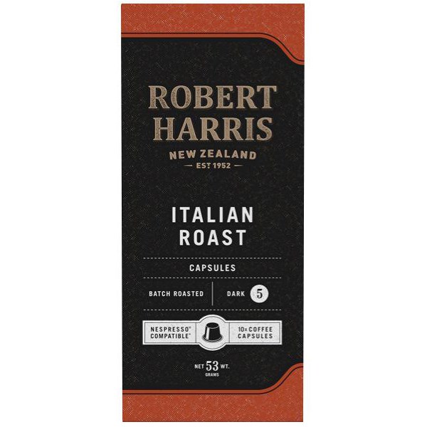 Robert Harris Italian Roast Espresso Coffee Capsules give you a true Italian-style coffee. Robert Harris's darkest and boldest roast. These beans are roasted until they are a dark ebony, giving you a rich, intense flavour that you don’t have to travel to Europe for.
