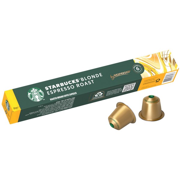Starbucks Coffee Capsules Blonde Espresso Roast comes in sealed capsules preserving the freshness of the coffee inside. The Blonde Espresso Roast has a soft, light and mellow flavour, made from a special blend of beans from Latin America and carefully roasted to bring out sweet, vibrant notes. The bold mellow notes make them blend well with milk, making classic espresso drinks extra smooth without a roasty edge.