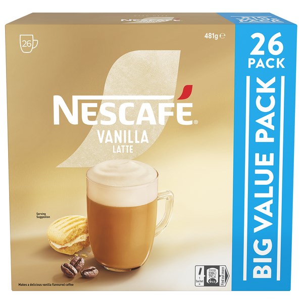 NESCAFÉ Café Menu Vanilla Latté Coffee is a single serve of delicious speciality frothy coffee made from premium quality coffee beans. Just add hot water, stir and enjoy. The answer to your favourite Café style coffee in a convenient, fuss free 18.5g sachet.