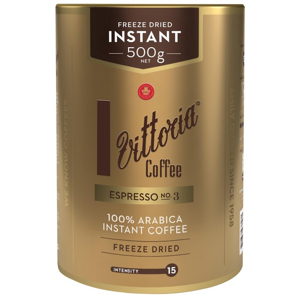 Enjoy a delicious beverage with this Vittoria Freeze Dried Instant Coffee. It is a premium blend of dark roast delivering a strong flavour of traditional Italian espresso. The 100% freeze dried Arabica produces a full-bodied smooth cup with an intense aroma. For convenience the coffee comes in a resealable 500g tin.