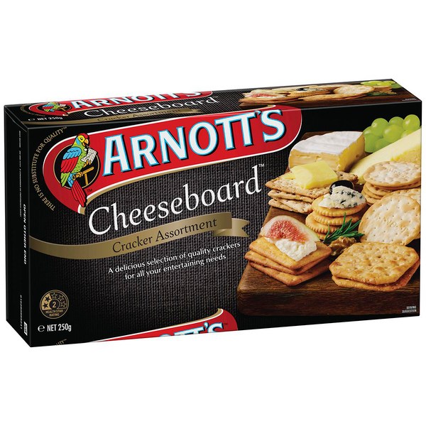 Arnott's Cheeseboard Selection Crackers are ideal for the entertainer. They are a selection of Arnott's most sought after crackers that can be eaten plain or with your favourite toppings. Original water crackers, sesame wheat crackers, harvest wheat, savoy, sesame water crackers and stone-ground crackers that are perfect with cheese.