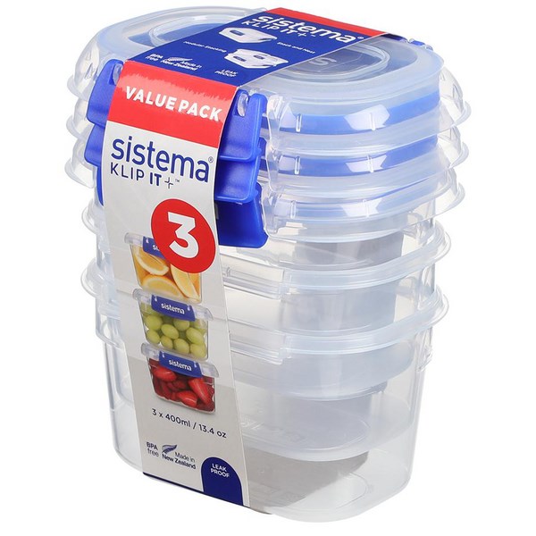 • Value pack of 3 x 400ml (13.4 oz) rectangular containers with easy to use locking clips