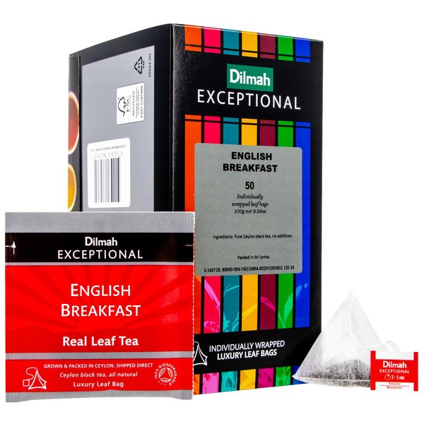 Dilmah Exceptional English Breakfast Tea is a Ceylon black tea with a rich, bold flavour. This deliciously different hand-picked tea chosen for its quality, taste and natural goodness is perfect for all day drinking. Loose leaf pyramid tea bags offer the real flavour of loose leaf tea in the convenience of a tea bag.