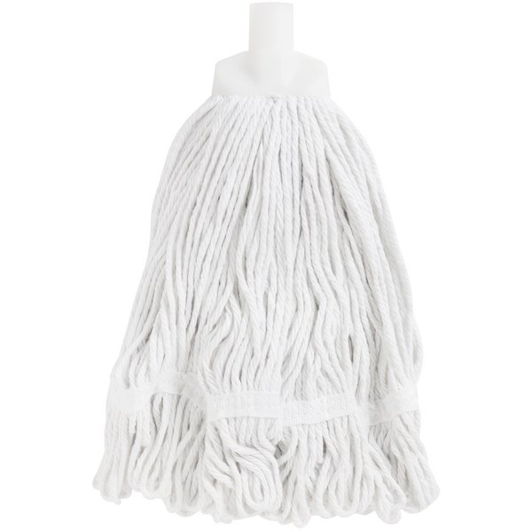 This white Fita anti-tangle washable cotton mop head features a looped end with an angled tail banding for easy laundering, along with a heavy duty mop socket. It is a hospital launder mop head that complies with regulations set by authorities for the healthcare industry. The bright white colour allows you to colour coordinate your mops to prevent cross-contamination.