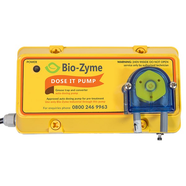 Bio-Zyme Dose it pump is designed to pump 100mls of Industrial product every day at a set time into a Grease convertor or grease trap. It is a small unit that plugs into a 3 point plug with battery backup. It is easily fitted under the bench of any kitchen.