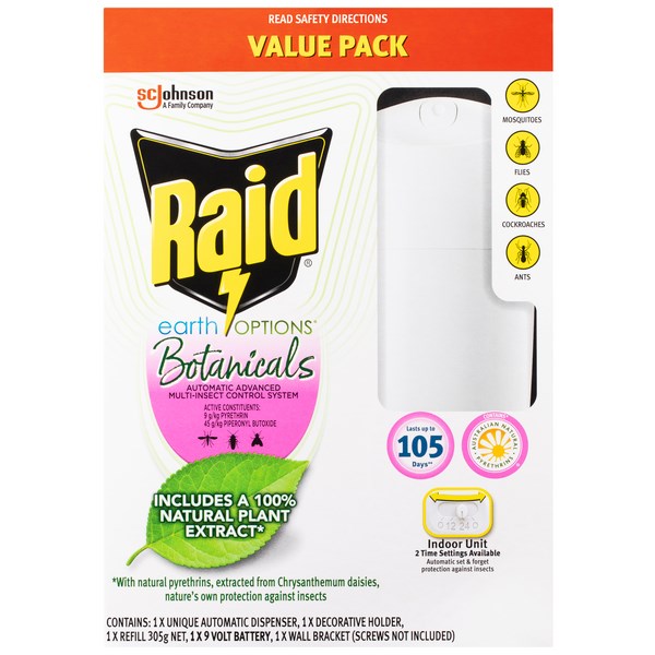 Continuously protect against flying and crawling insects with the Raid Earth Options automatic advanced multi-insect control system. It contains natural pyrethrins that are extracted from chrysanthemum daisies, natures protection against insects. The control system disperses odourless protection and has 2-time settings. The 305g refill lasts up to 105 days when used on the 12-hour setting and is suitable as an indoor unit. Dispenser and refill are both supplied in this control system.