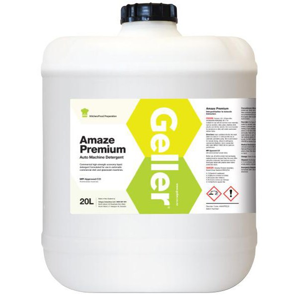 This Geller Amaze Premium Auto Machine Detergent is a high strength, economy dishwashing liquid designed for use in commercial automatic dish and glass washing machines. The low foaming formula is ideal for use with china, crockery, glass, plastics, stainless steel, kitchen utensils and other common materials. Not recommended for use with aluminium and other kitchen items constructed from soft metal.