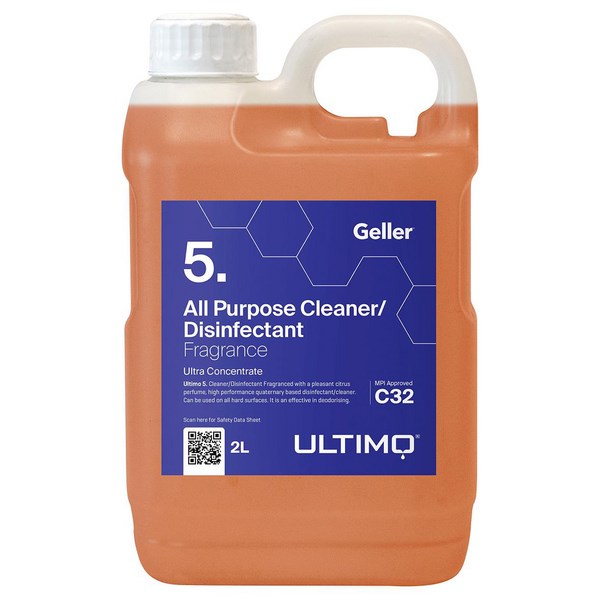 This Geller Ultimo 5 All Purpose Cleaner Disinfectant is fragranced with a pleasant citrus perfume. It is a high performance quaternary based disinfectant cleaner. It can be used on all hard surfaces and is effective in deodorising and disinfecting smelly areas.