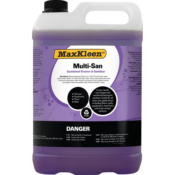 Keep your areas sqweaky clean and fresh with the MaxKleen Multi-San Combined Cleaner and Sanitiser. This non-fragranced detergent and sanitiser is perfect for all areas, such as floors, walls, equipment and food contact situations. It comes in an economical 5-litre bottle, perfect for keeping in the cleaning cupboard for quick and easy refilling of your applicator bottle when you are running low.