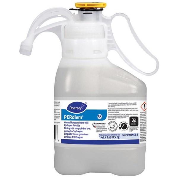 This Smartdose PERdiem General Purpose Cleaner is a concentrated cleaner which features proprietary Accelerated Hydrogen Peroxide technology for high-productivity cleaning. This highly versatile technology enables the multipurpose cleaner to clean floors, bathrooms, glass and hard surfaces. It can also be used for carpet spotting and extraction cleaning.