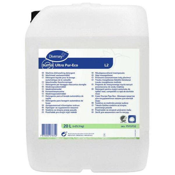 This Suma Ultra Pur-Eco L2 Dishwasher Liquid is a concentrated detergent specially formulated for machine ware. Designed for excellent removal of grease, food and more in soft water conditions. Suitable for use with single and multi-tank dish washing machines.