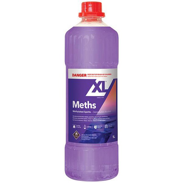 XL Methylated Spirits XL has excellent cleaning properties and is a great solution for removing paint, light oils, grease and pen marks. Methylated spirits are derived from pure ethyl alcohol, and liquid is purple in colour. Good for use in cleaning, art classes, schools and more. Can be used to clean floors and surfaces, for sterilising dental and medical instruments and for cleaning at home.