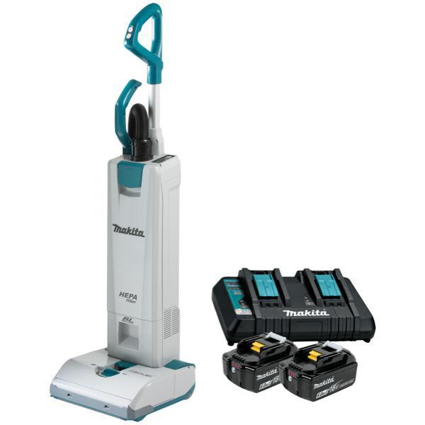 This Makita LXT Upright Vacuum Cleaner Kit features 36V lithium-ion battery power to eliminate annoying cords as you clean. The vacuum cleaner has an upright design and 3 speed options of high, medium and low. The vacuum cleaner has two 18V lithium-ion batteries to create 36V of power. It features a two stage efficient HEPA filter that picks up most particulates 0.3 microns or larger.