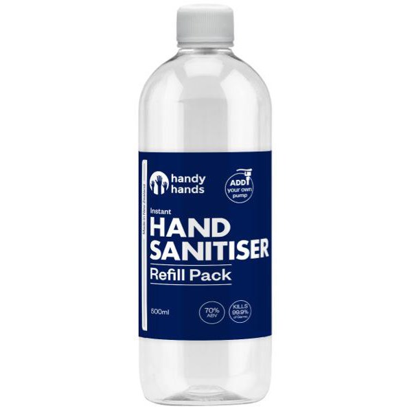 Formulated with 70% alcohol by volume, Handy Hands is an instant hand sanitiser powerful enough to sanitise your hands by killing 99.9% of all germs. This non-coloured, clear sanitiser is supplied in a 500ml refill bottle and is designed to be used in conjunction with an empty trigger spray bottle for easy dispensing.