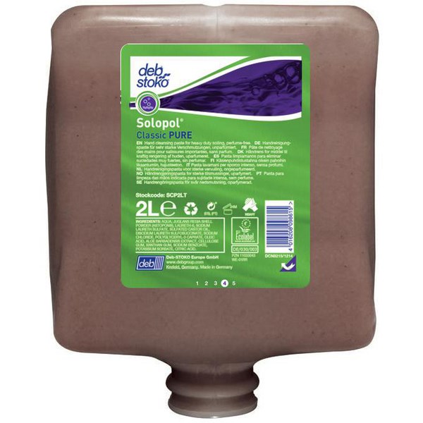 Deb Stoko Solopol Pure Hand Cleanser has a dye free formulation and is a paste that is combined with perfume, making it ideal for the removal of heavy contamination. It contains Astopon which is a natural scrubbing agent that gently removes contaminants without damaging the skin. This refill bottle fits into Deb dispensers and contains 2 litres of hand cleansing paste.