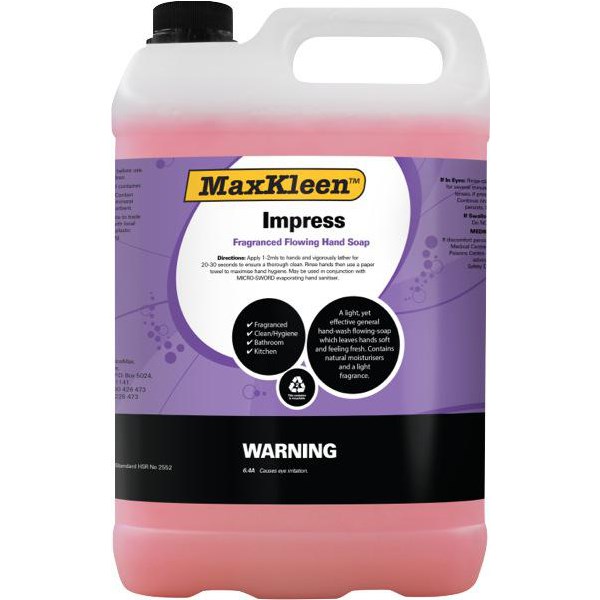 The MaxKleen Impress Fragranced Flowing Hand Soap is a light yet effective general hand-wash flowing soap which leaves hand soft and feeling fresh. It contains natural moisturisers and a light fragrance. A pump cap can be inserted into the bottle to allow the soap to be easily dispensed directly from the bottle. The 5L Ideal for use in high traffic bathrooms and kitchens.
