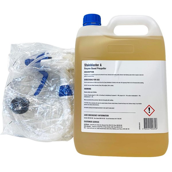 This Ecolab Stainblaster A is excellent for removing soiling from upholstery, delicate carpet and fabrics. The effective stain remover contains multiple surfactants, water soluble solvents and powerful enzymes ideal for treating stains from food, blood, urine, faeces, grass and cosmetics. Great for cleaning collars and cuffs, and works particularly well on protein based soiling. The easy to use formulation can be directly applied onto the affected fabrics before washing.