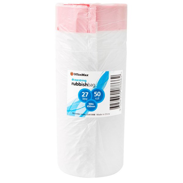 These OfficeMax rubbish bags with drawstrings come in a convenient and easy to use roll. Each roll comes with 50 rubbish bags that measure 500x650mm with a 60mm drawstrings. One bag can hold up to 27 litres worth of rubbish. Made from sturdy and durable material, these rubbish bags help to prevent leakage and unpleasant odours escaping. Perfect for storing under your kitchen sink or in the garage.