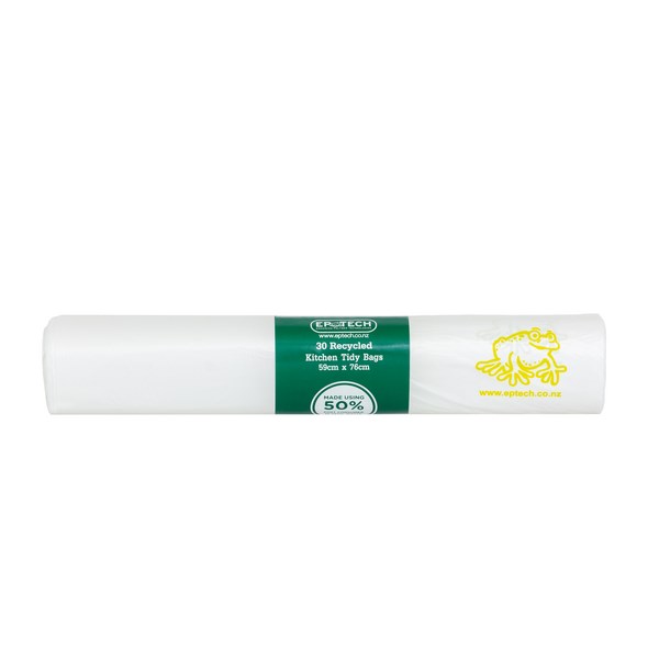 These 20mu EP Tech Recycled Kitchen Tidy Rubbish Bags are made from post-consumer recycled content. Each kitchen tidy bag measures 590x760mm and has a 36-litre capacity. Made from sturdy and durable HDPE these trash bags help contain odours and allow you to easily dispose of waste and keep rubbish bins clean. Ideal for use in work environments, offices, schools and at home. Bags come in a roll of 30.