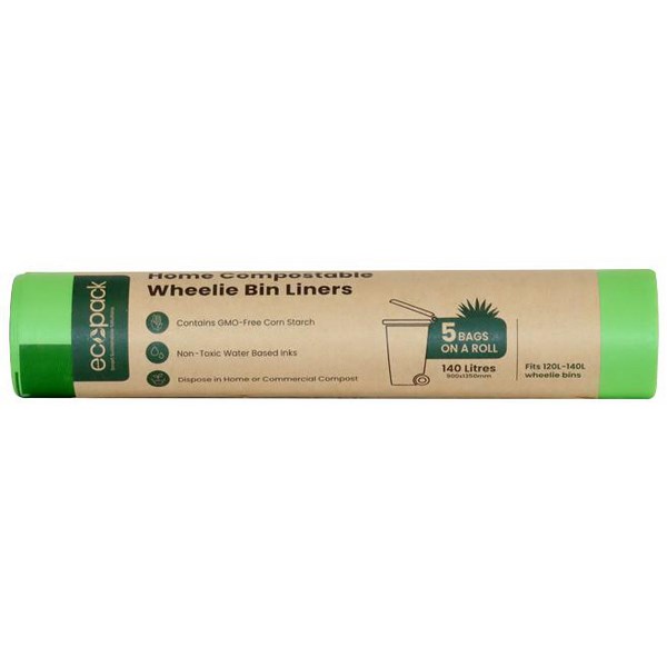 These 120-140L Ecopack Home Compostable Wheelie Bin Liners feature extra microns for strength and are made for wheelie bins and commercial use. These liners are printed with non-toxic inks and contain corn starch, PLA and PBAT and are certified home and commercially compostable, making them a great, environmentally conscious way of diverting waste away from landfill.