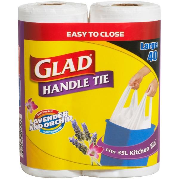 Glad Handle Tie Bin Liners feature a long lasting lavender and orchid scented allowing you to disguise those unwanted smells. These bin liners are easy to close up and carry, just wrap the handles together and throw out. Fits a 35L kitchen bin.