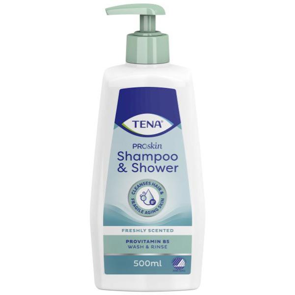 Designed for elderly fragile skin and hair, TENA ProSkin Continence Shampoo and Shower is a dual purpose cleansing gel and conditioning shampoo that helps to leave the body feeling fresh, clean and free from odours. Containing Provitamin B5 and anti-static properties, it makes hair easy to manage and comb after use. This shampoo and shower gel comes in a 500ml pump bottle for easy dispensing.