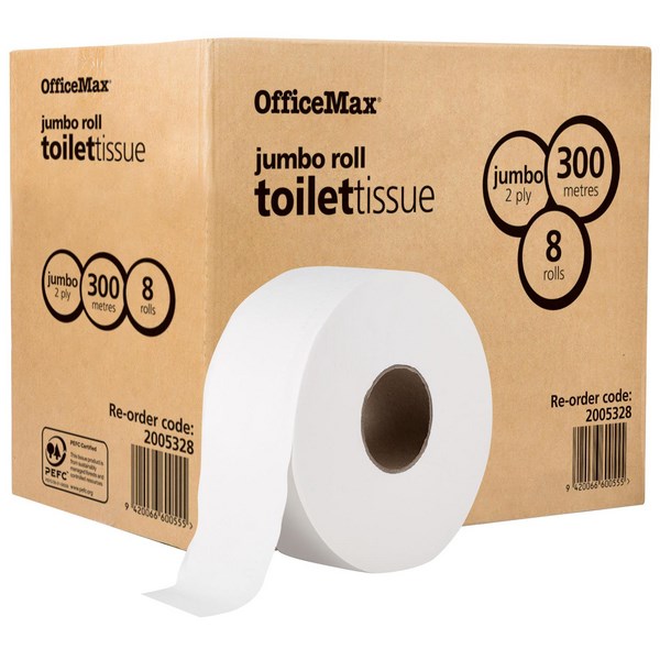 OfficeMax Toilet Tissue is premium quality white toilet tissue. It is gentle on skin but also combines softness with strength and absorbency. The toilet tissues are suitable where quality and value are of utmost importance. This jumbo toilet tissue is 2 ply, measures 300m and comes in a carton of 8 rolls. Perfect for use in the workplace or public places that have high traffic volume.