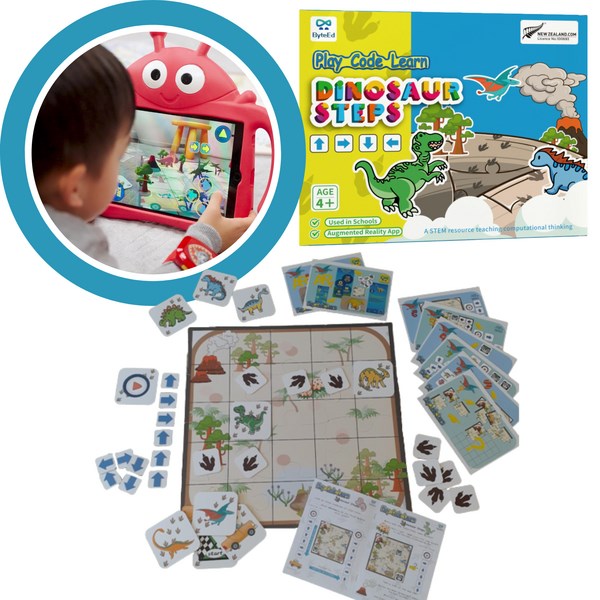 The Play Code Learn Dinosaur Steps aids the teaching of future focused skills and techniques whether in school for student-led or teacher-taught activities. It uses an engaging, playful learning approach to practise logical thinking and problem solving, and build a growth mindset. It combines ‘unplugged’ activities with ‘plugged in’ digital tools. The Play Code Learn Dinosaur Steps incorporates AR experiences to deepen and inspire learning, preparing all learners for today’s society. It has supportive, progressive teaching resources and PLD that help teachers to learn how to teach digital technologies and computational thinking at many year levels. Integrated learning with curriculum subjects including literacy and numeracy and deepening technological literacy.