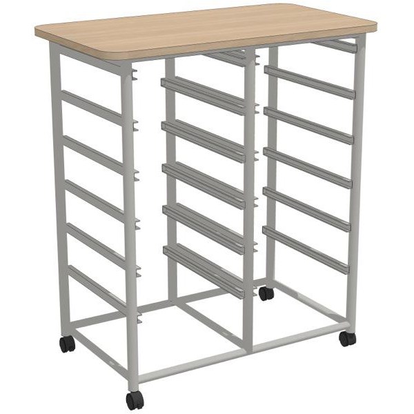 This Interior Resources Sitrite Tote Trolley is designed for use with leading construction brick brand trays measuring 310x420mm. The trolley features two bays with space for a total of twelve trays. A convenient way to store and access this great educational resource for hours of fun and learning. 50mm nylon castors for easy movement around the classroom and between learning spaces. Trolley has a fully welded, powder-coated frame with 18mm Melteca top that has classroom friendly rounded radius corners. Designed to hold popular construction brick trays.