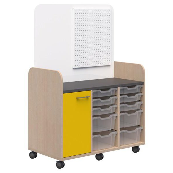 This Makerspace Mobile Trolley is the perfect way to store all your makerspace materials in one easily accessible space. The trolley features 6x 70mm locking plate castors that let you conveniently wheel your trolley wherever you need it. The mobile trolley comes with 6x F1 and 4x F2 translucent Gratnell trays for simple storage. The mobile trolley has a write-able HPL whiteboard and a steel pegboard with 6x 50mm hooks to hang tools.