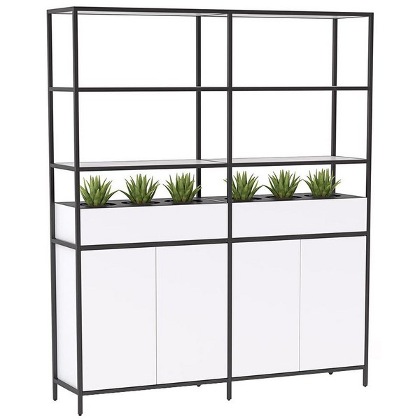• Kubix double shelving unit featuring two large cupboards at the base, two planters above, and open shelving