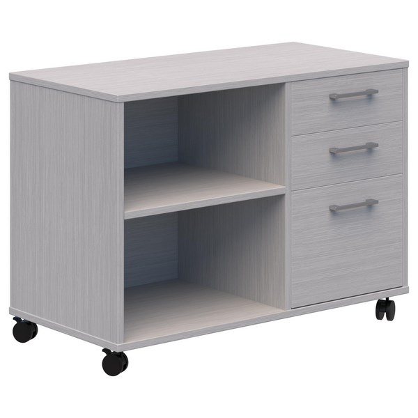 • Mobile caddy with drawers and open shelving with right-hand orientation