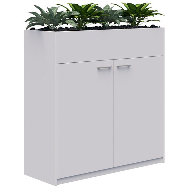Add a modern stylish piece of furniture to your space with this Fiord Storage Planter Hinged Door. It is made up of a storage unit with a planter on top. The planter holds up to 4 artificial plants on a platform filled with polished black stones. Unit comes fully assembled but plants and stones need to be placed inside the planter box.