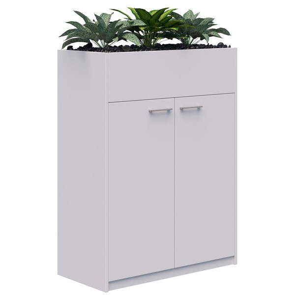 Add a modern stylish piece of furniture to your space with this Fiord Storage Planter Hinged Door. It is made up of a storage unit with a planter on top. The planter holds up to 3 artificial plants on a platform filled with polished black stones. Unit comes fully assembled but plants and stones need to be placed inside the planter box.