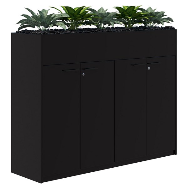Add a modern stylish piece of furniture to your space with this Fiord Lockable Storage Planter Hinged Door. It is made up of 2 lockable storage units with a planter on top. The planter holds up to 5 artificial plants on a platform filled with polished black stones. Unit comes fully assembled but plants and stones need to be placed inside the planter box.