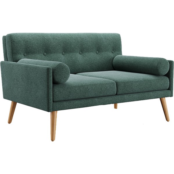 The Frankie 2 Seater Sofa is a stylish and sophisticated chair suitable for both commercial and domestic use. It can be used as a waiting room chair, an occasional chair, or as part of a lounge suite in a breakout area. The sofa is upholstered in Warwick Hawthorn Forest fabric with Halo treatment for spot cleaning. It measures 1300x830x780mm (wxdxh) and it has clear-finish timber legs. The sofa is filled with elephant foam for durability and comes with 2 bolster cushions.