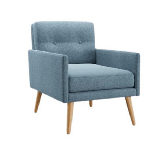 The Frankie Slim Chair is a stylish and sophisticated chair suitable for both commercial and domestic use. It can be used as a waiting room chair, an occasional chair, or as part of a lounge suite in a breakout area. The sofa is upholstered in Warwick Hawthorn Sky fabric with Halo treatment for spot cleaning. It measures 680x830x780mm (wxdxh) and it has clear-finish timber legs. The sofa is filled with elephant foam for durability.