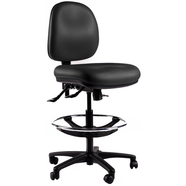 and four seat adjustment options, this chair provides the perfect solution for all day comfort and support. It also features a star base with castors for easy mobility and a foot ring that allows for a comfortable seating position. Chair footrings help support user's legs for various height requirements so that problems including fatigue, poor posture and decreased circulation can be avoided. This chair is upholstered in vinyl, making it easy to wipe to keep clean.