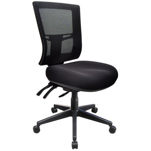 •A black 3 lever office chair with a fine mesh mid back and a contoured foam seat