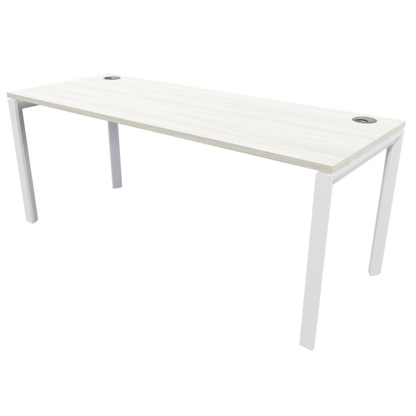 The Novah Workstation is a sleek and modern commercial office desk with a stylish white powder-coated steel frame base supported by levelling feet. It features convenient cable management ports and a 25mm Melamine top with a rigid matching PVC trim for a polished look.
